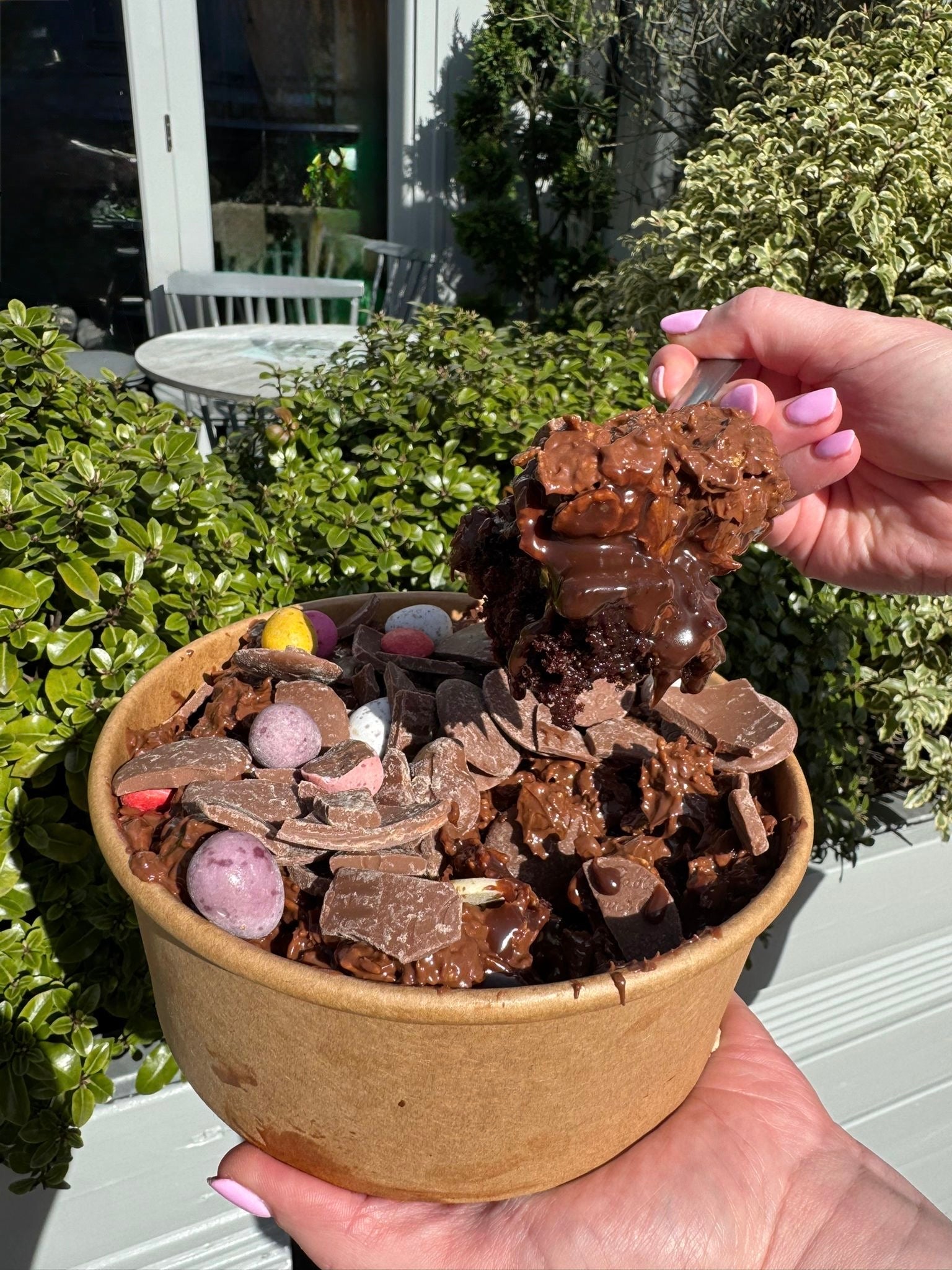 The most exciting bowl of cereal you'll ever eat. We start with a layer of chocolate cake then add our homemade chocolate sauce, top with chocolate cornflakes and broken easter chocolate.