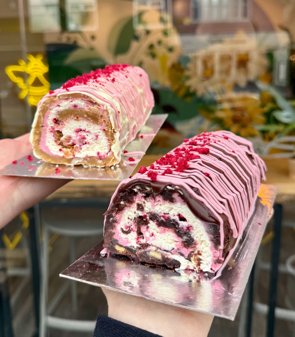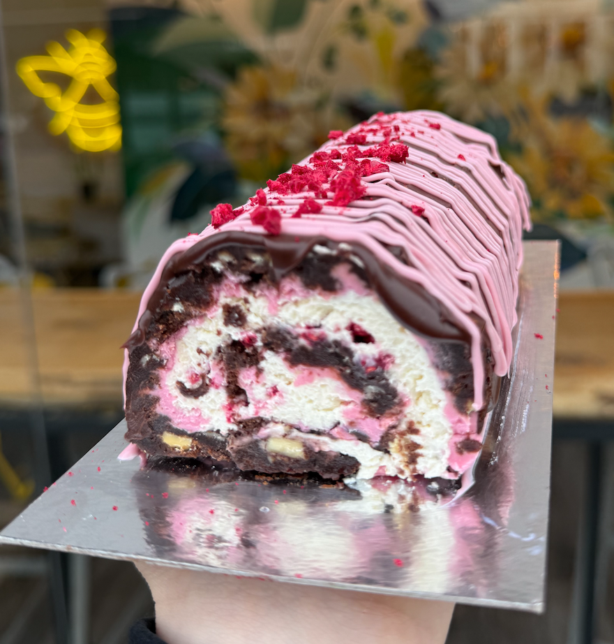 Our rich, fudgy brownie base is generously filled with pink white chocolate, freeze dried raspberries and whipped fresh cream – a dreamy flavour combination that will keep you coming back for more!